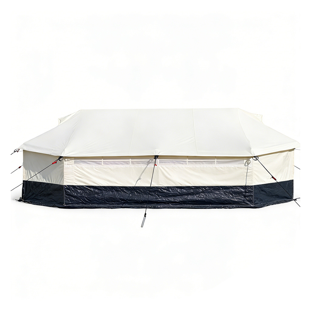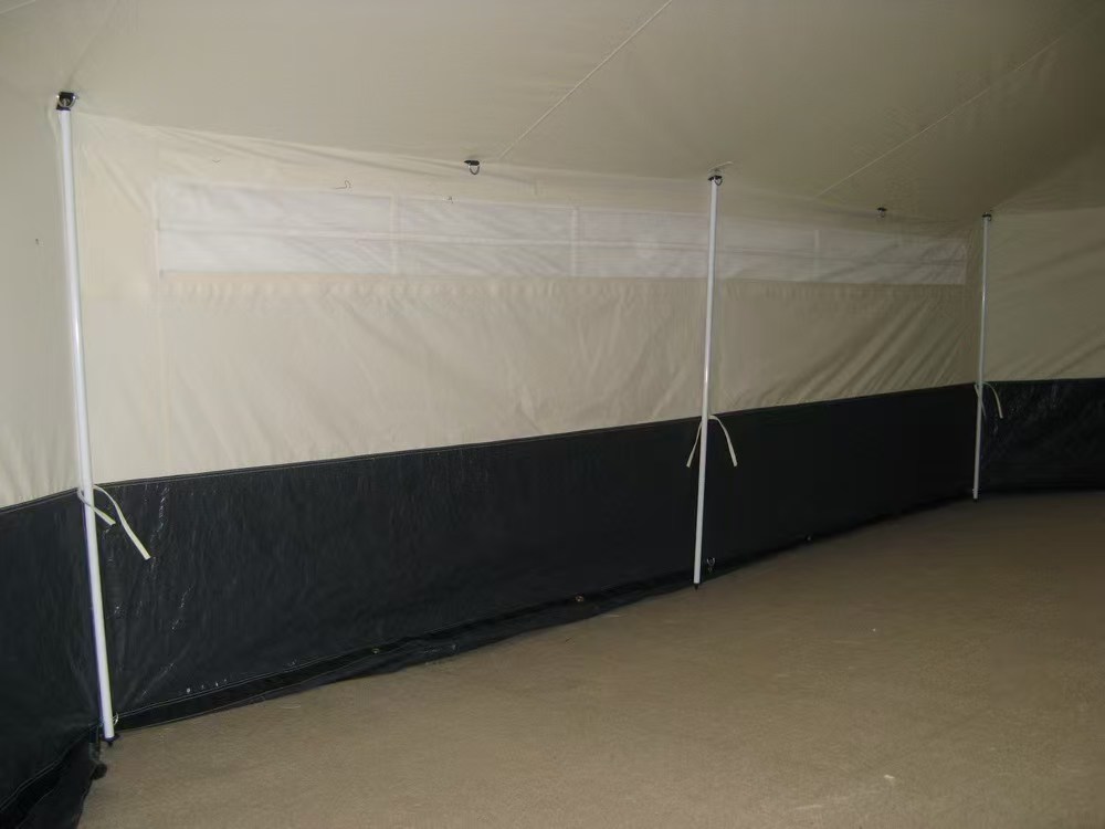 With a main living area of 16 m² and two vestibule spaces, the tent offers practical interior space for sleeping, storage, and daily activities. The structure features high-density polyethylene (HDPE) woven fabric laminated with LDPE coating, providing excellent resistance to rain, UV exposure, and wear in harsh field environments.